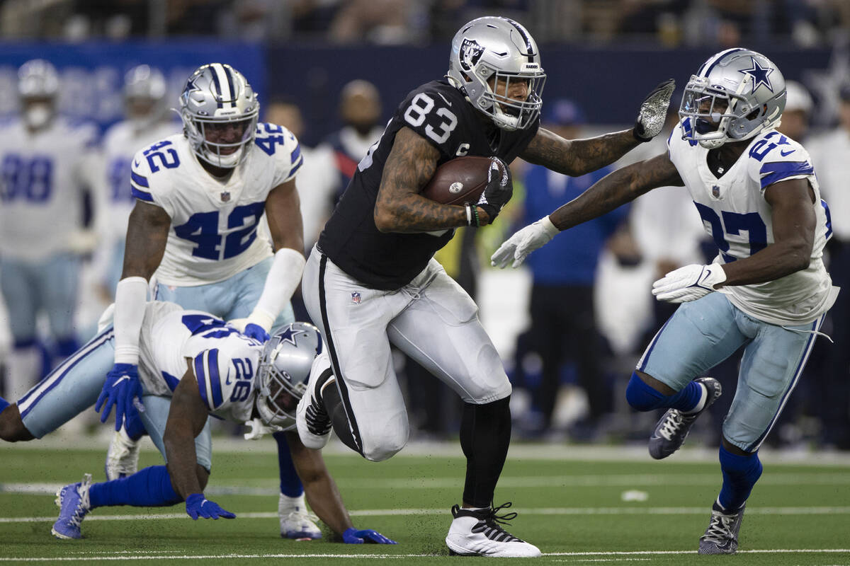 KANSAS CITY — The Raiders will face the Kansas City Chiefs without three key starters. Among the Raiders who are inactive due to injuries are tight end Darren Waller (knee), linebacker Denzel Perryman (ankle) and defensive end Carl Nassib, who has a knee injury.
