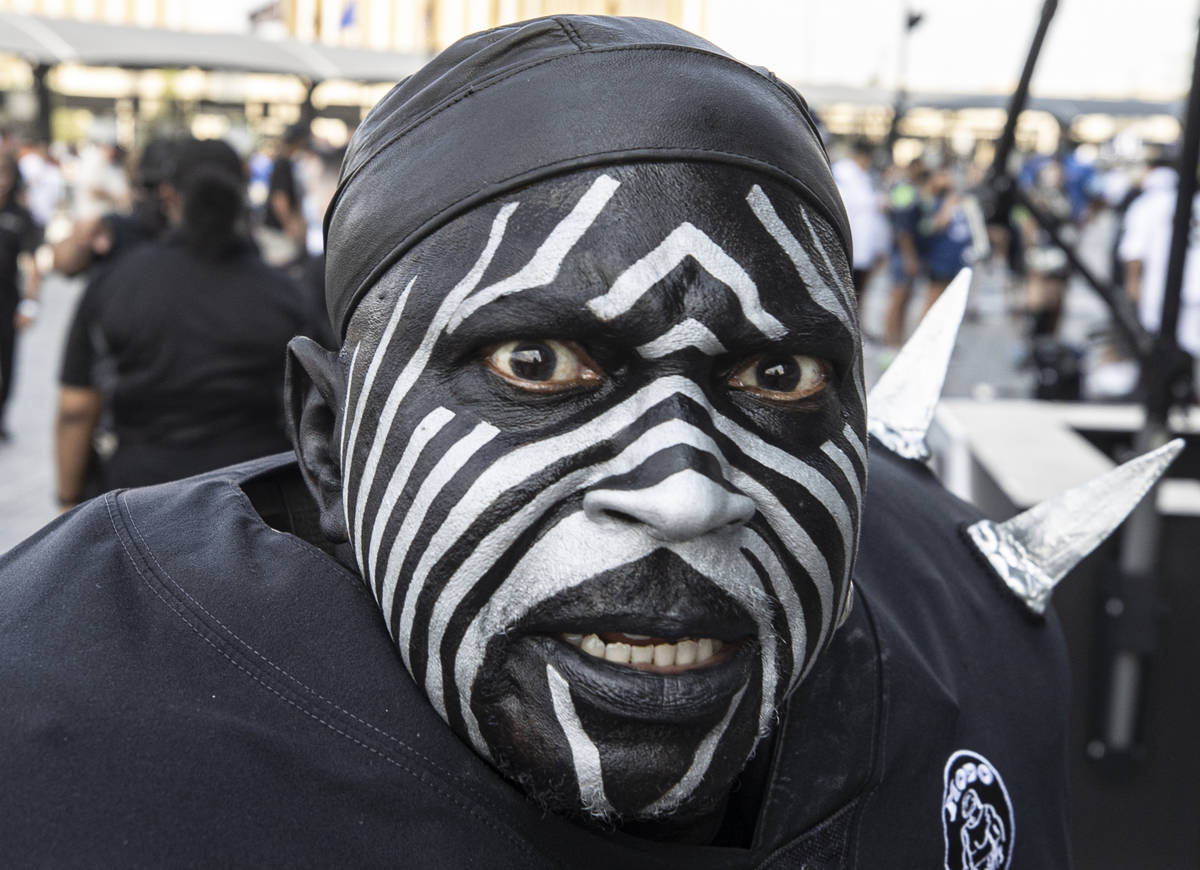 David Perrico and his band are entertaining Raiders fans eagerly awaiting the 6 p.m. kickoff, while some fans pose for pictures in the Black Hole section of Allegiant Stadium.