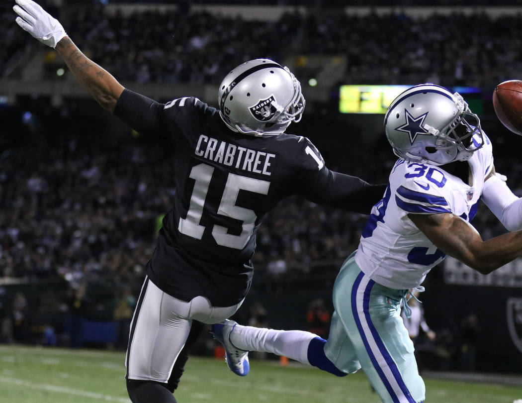 The two relived some history, executing a play similar to one from an Oct. 19 thrilling win over the Kansas City Chiefs. On that day, Carr took a snap delivered from the 2-yard line, rolled out and, with no time in regulation remaining, fired a strike at Crabtree’s triple-XL gloves for a game-winning score.