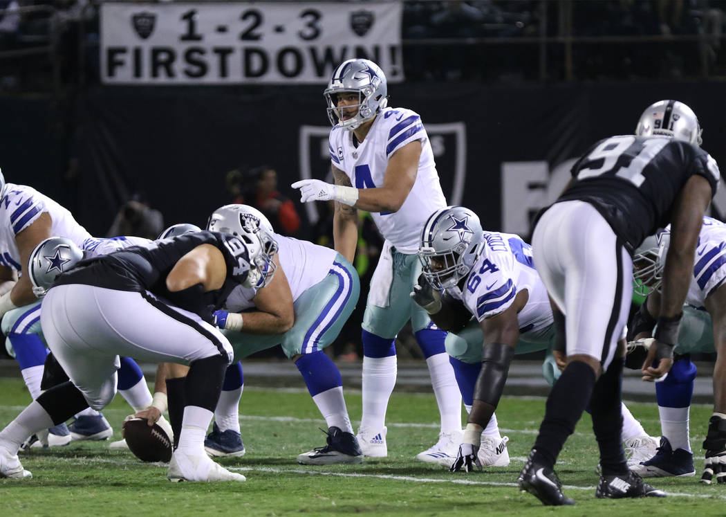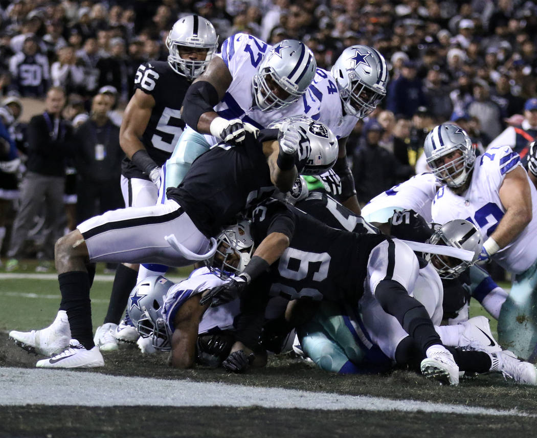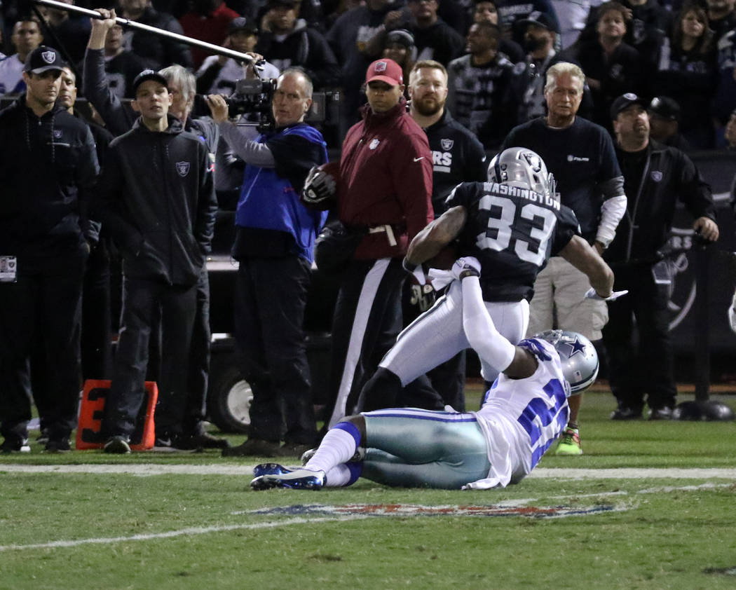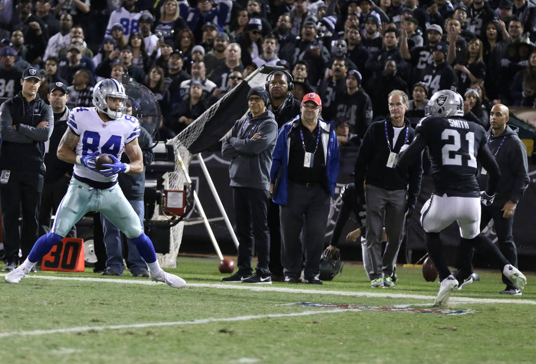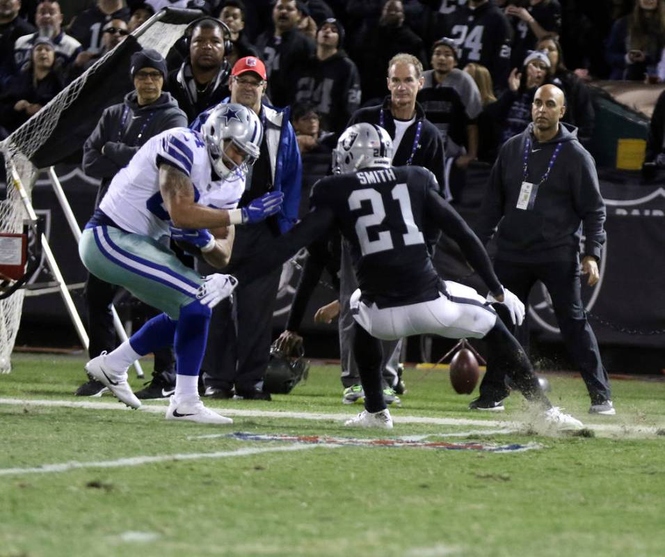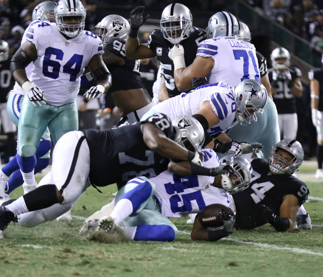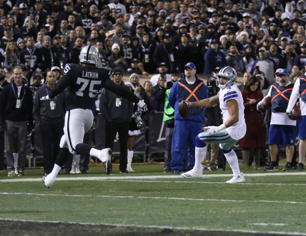 OAKLAND, Calif. — A thin white index card, small enough to fit into a pocket, light enough to waltz into the air from a faint breeze, was held over a football as 55,372 fans fixated on the drama unfolding. Raiders players and coaches screamed toward the paper. Dallas Cowboys players and coaches hollered, too. A lengthy conversation between officials followed.