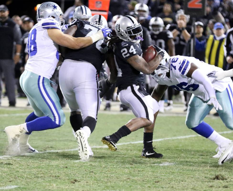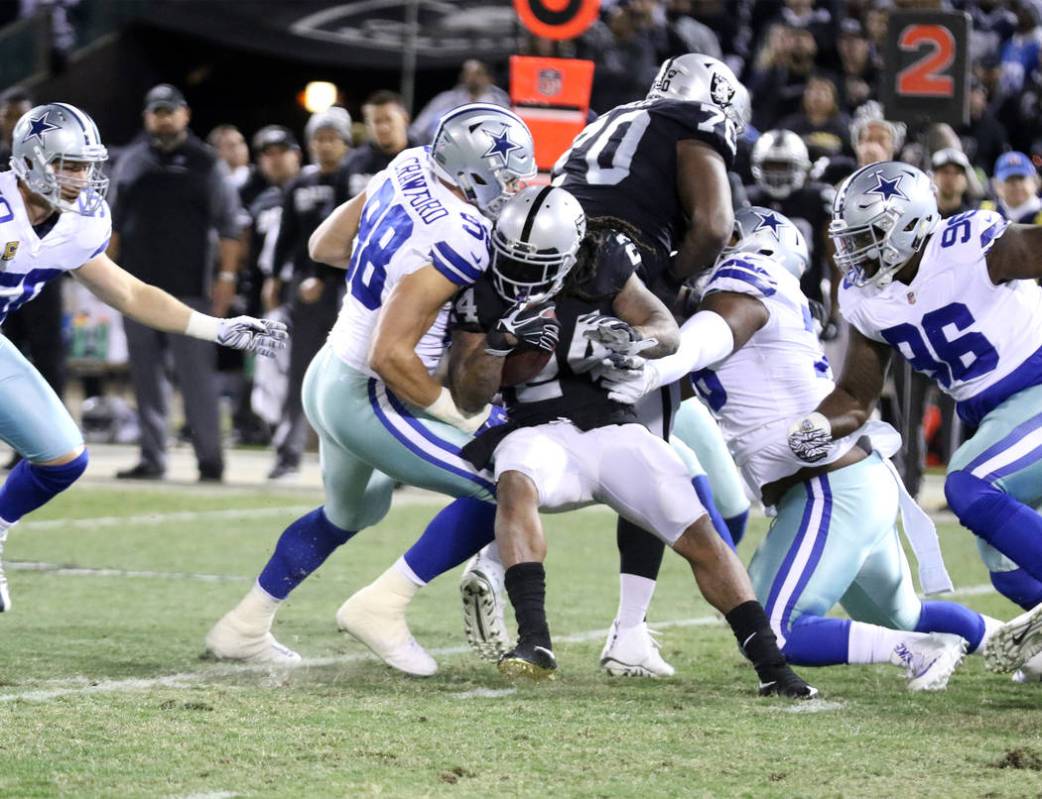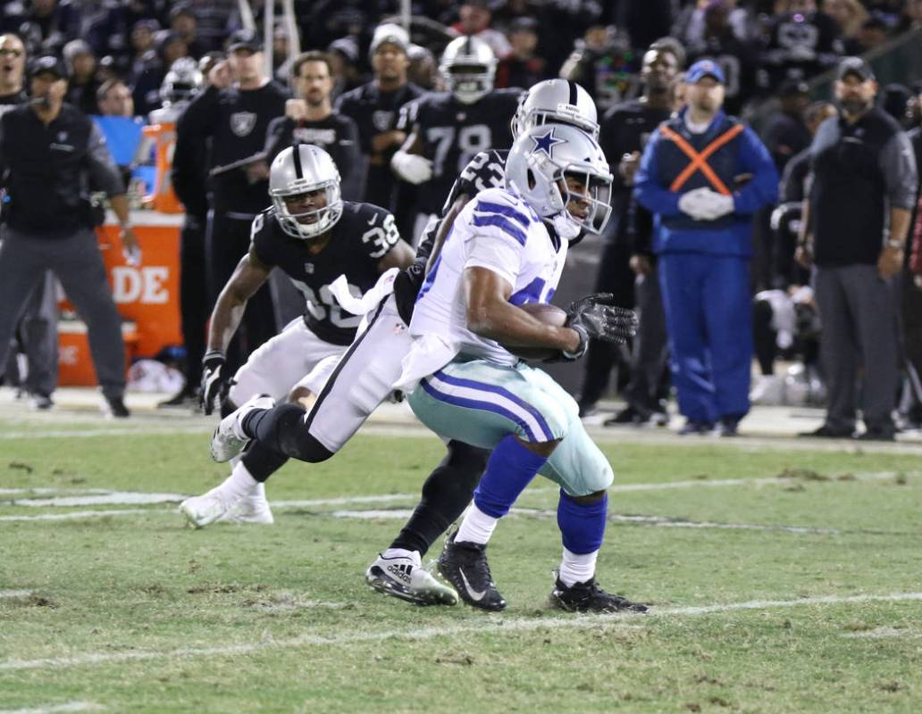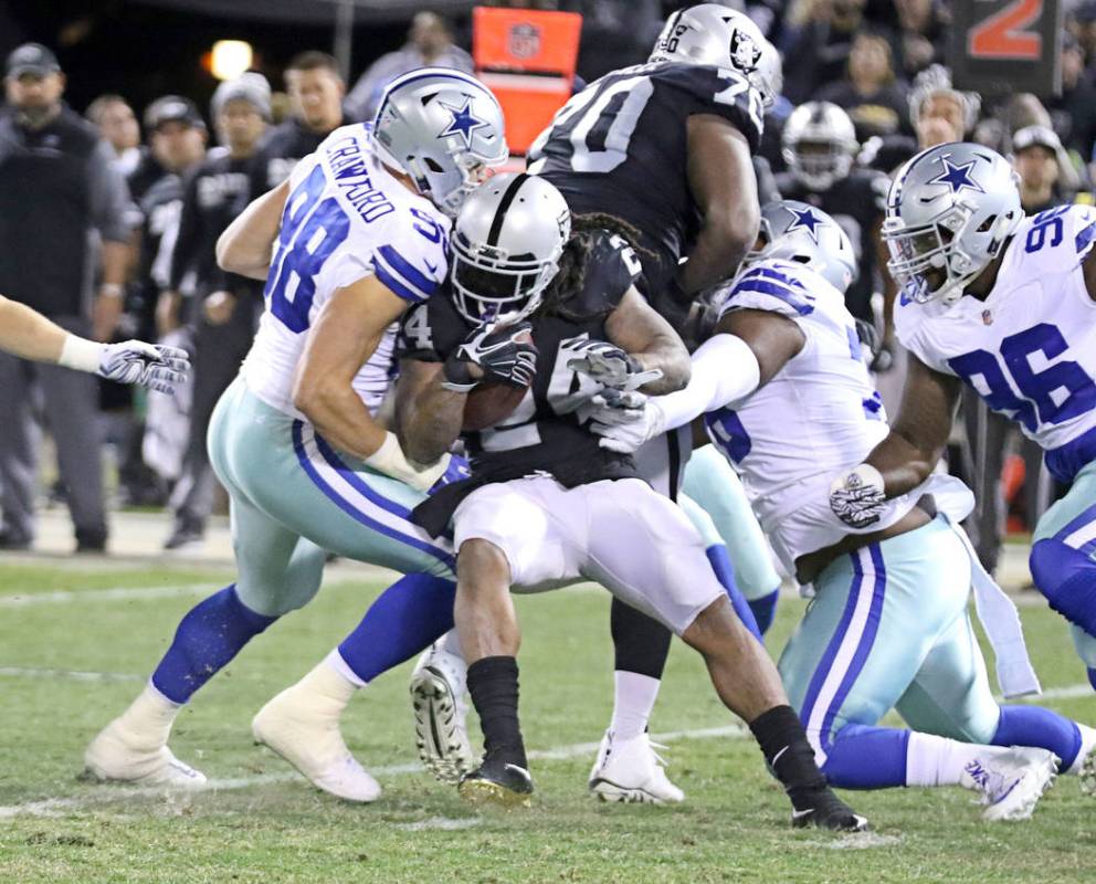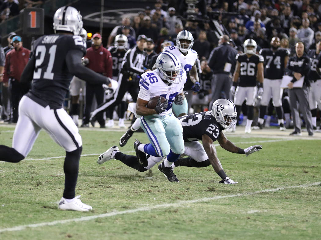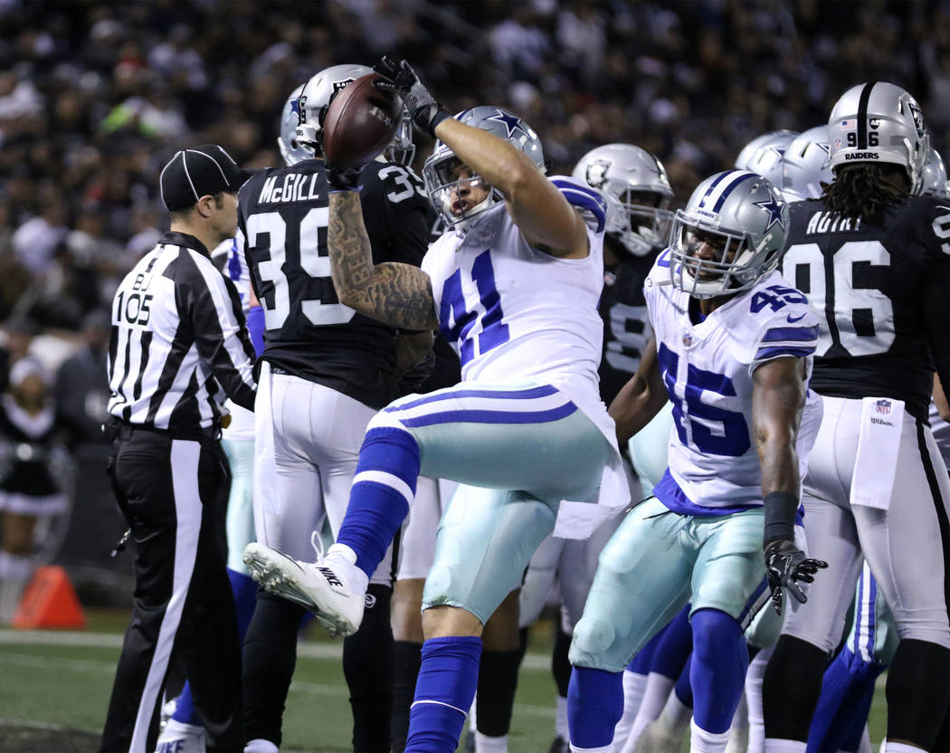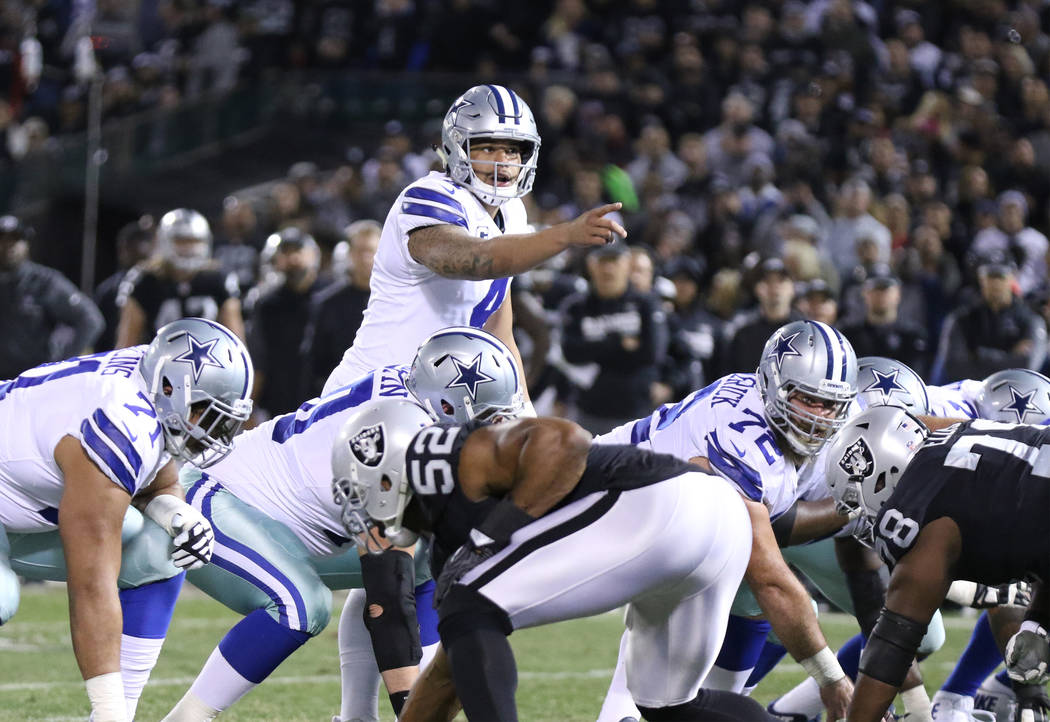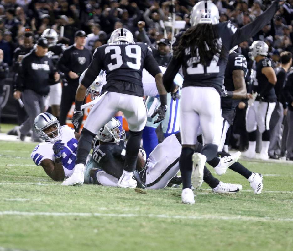 OAKLAND, Calif. — A thin white index card, small enough to fit into a pocket, light enough to waltz into the air from a faint breeze, was held over a football as 55,372 fans fixated on the drama unfolding. Raiders players and coaches screamed toward the paper. Dallas Cowboys players and coaches hollered, too. A lengthy conversation between officials followed.