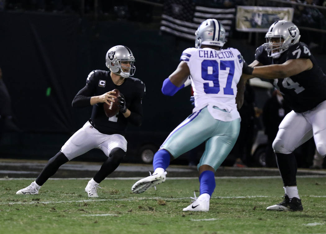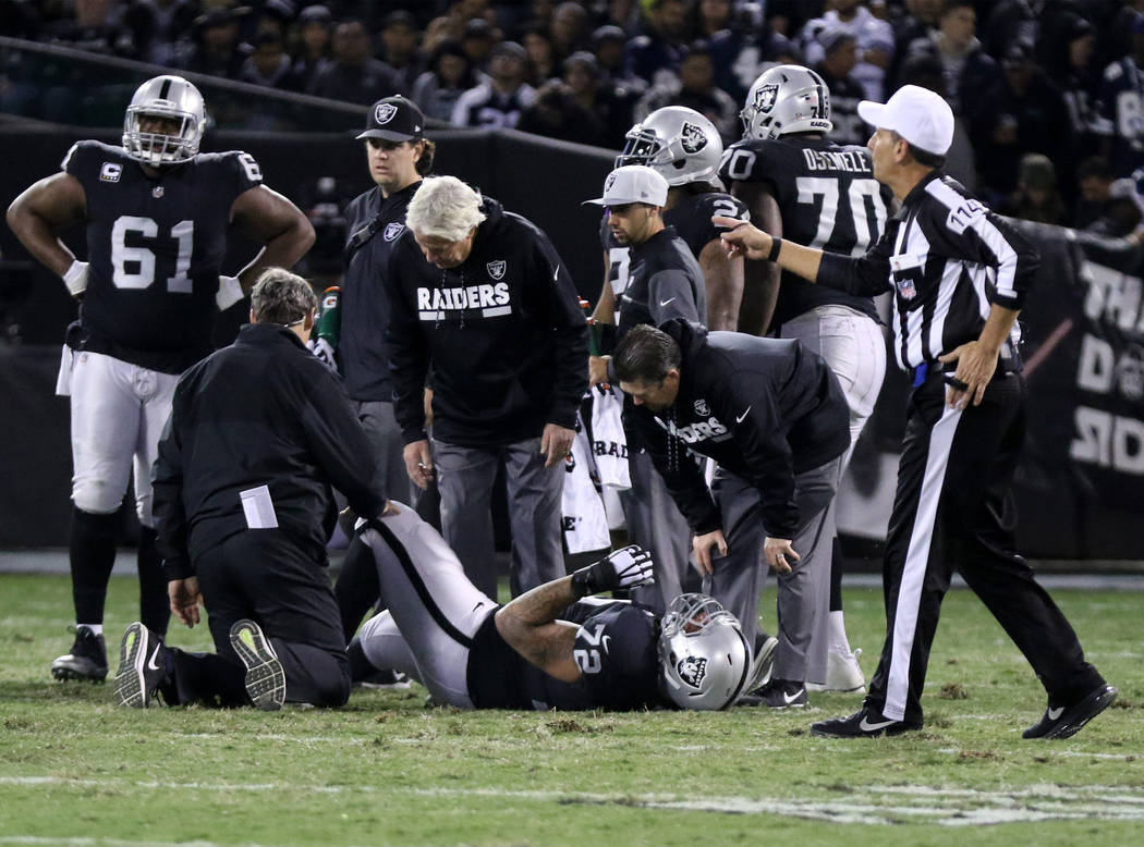 Carr started the game without wide receiver Amari Cooper, inactive with an ankle injury. He ended it without his other most trusted option. Wide receiver Michael Crabtree was forced to the sideline medical tent to be evaluated for a concussion. He was under a collapsible structure for the fateful touchback.