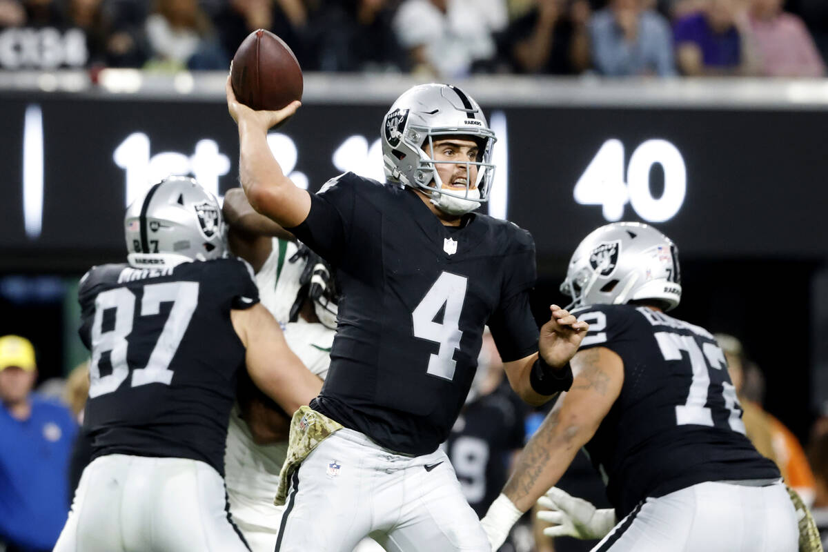 In his third start, rookie quarterback Aidan O’Connell labored against New York’s stout defense, telegraphing a first-half interception to Jordan Whitehead. The offensive line, missing standout left tackle Kolton Miller, was often overwhelmed by the opposing defensive front. But O’Connell maintained his poise in the second half and came off his first read on a key third down early in the fourth quarter to throw the go-ahead touchdown to fellow rookie Michael Mayer.