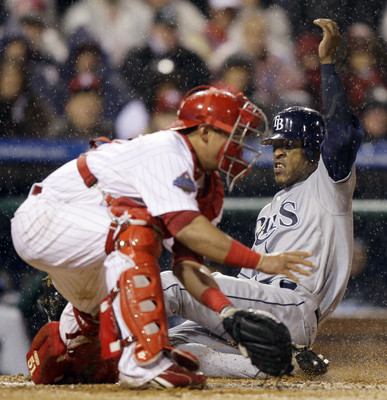 B.J. Upton beat out an infield hit with two outs in the sixth on a ball that Rollins bobbled. Upton stole second and hustled home on Pena's hit, with left fielder Pat Burrell's throw home plopping into a puddle in the grass.