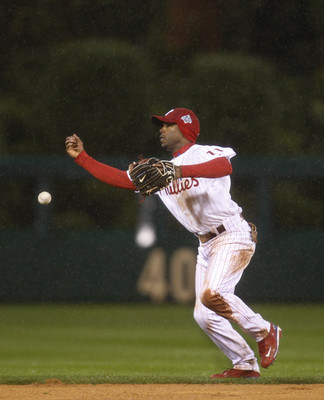 All-Star shortstop Jimmy Rollins of the Phillies chased a popup all over and dropped it for a tough error in the fifth. There were pools of water at every base and the Phillie Phanatic wore a rain slicker for his routine.