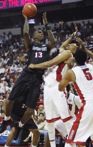 Rattled by the Aztecs’ defensive pressure and trapping, the Rebels committed eight turnovers in the first eight minutes. But they put together a 10-0 run, and Olekaibe’s 3-pointer from the corner cut San Diego State’s lead to 33-32 with 1:24 left.