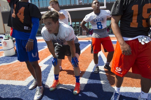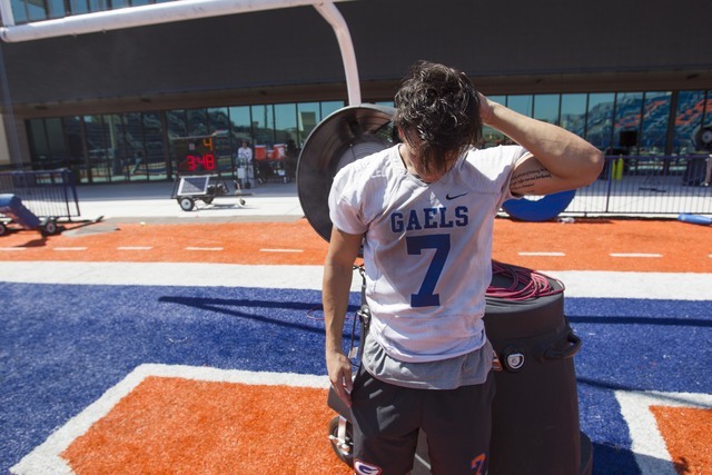 With temperatures hovering around 100 degrees, Biaggio Ali Walsh leaves Fertitta Field after another sweaty morning practice at national football power Bishop Gorman High School.