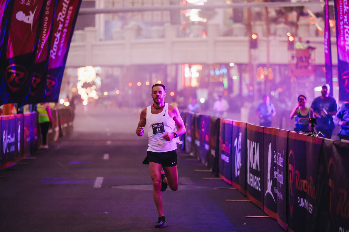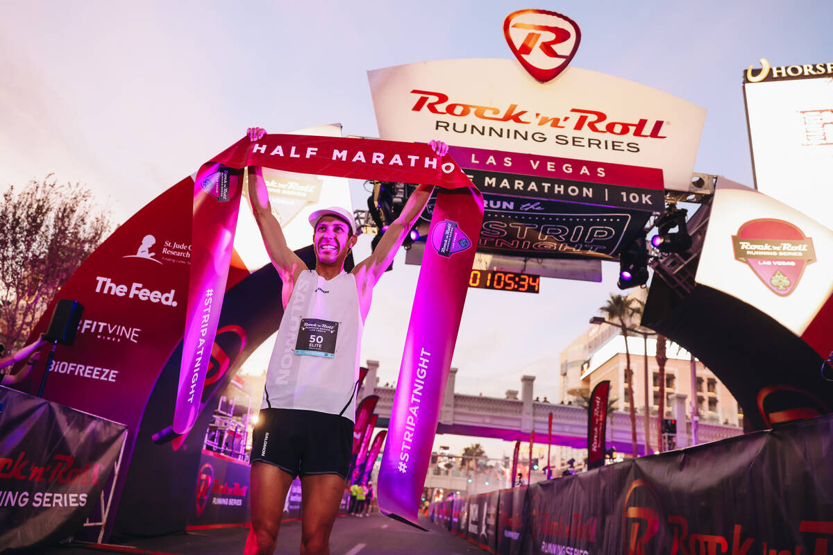 Ten years after the professional trail runner settled for second place in the Rock ‘n’ Roll Running Series Las Vegas half-marathon and two years after he took third, Wacker won the event Sunday night on the Strip, finishing the 13.1-mile course in one hour, four minutes, 47 seconds.