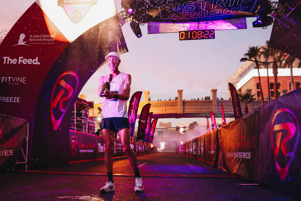 The 35-year-old from Boulder, Colorado popped open a bottle of prosecco at the finish line in front of the Fountains of Bellagio to celebrate his victory amid fog, flashing lights and plumes of fire on closed-down Las Vegas Boulevard.