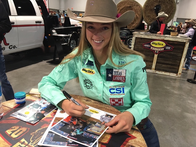 That includes barrel racer Sarah Rose McDonald. But there’s one problem: she’s lost her voice, as noted by a sign on the table where she’s perched. But it doesn’t stop her from signing posters and handing them out to fans, or posing for a photo or two. And in whispered tones, she manages to talk a little about the expo.