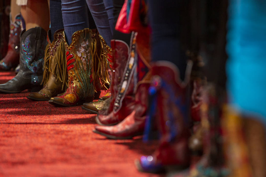 Boots worn and personally designed boots by Taylor Spears of Oklahoma join others on stage for the Miss Rodeo America Justin Boot Parade during Cowboy Christmas at the Las Vegas Convention Center on Saturday, Dec. 7, 2019, in Las Vegas. (L.E. Baskow/Las Vegas Review-Journal) @Left_Eye_Images