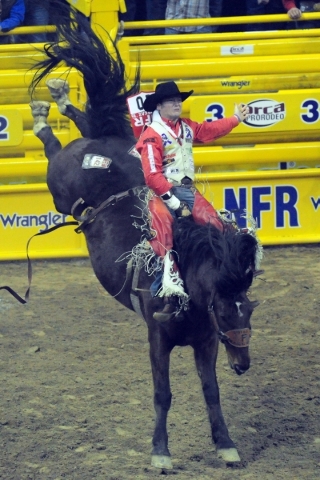 Bareback rider Steven Peebles from Redmond, Ore., rides rides Full Baggage to a first place score of 89.5 during the 8th go-round of the National Finals Rodeo at the Thomas & Mack Center in Las Vegas Thursday, Dec. 10, 2015. Josh Holmberg/Las Vegas Review-Journal