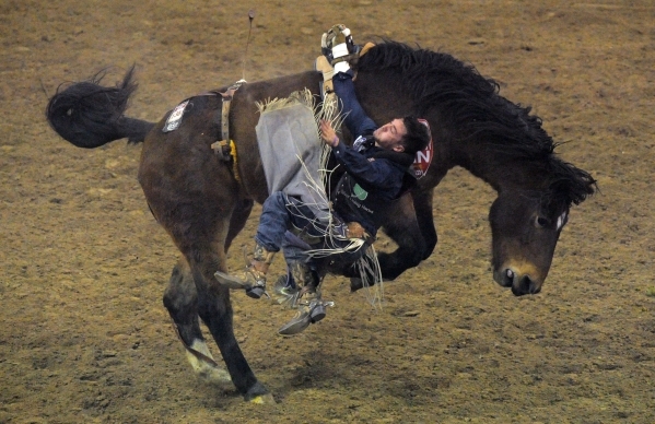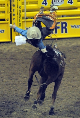 Bareback rider Caleb Bennett from Tremonton, Utah, is bucked from his horse during the 8th go-round of the National Finals Rodeo at the Thomas & Mack Center in Las Vegas Thursday, Dec. 10, 2015. Josh Holmberg/Las Vegas Review-Journal