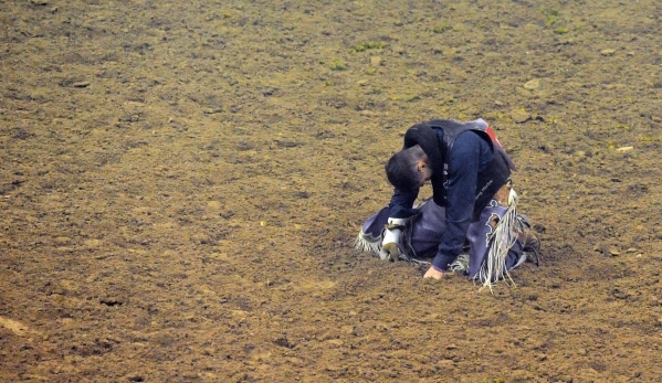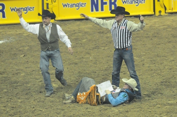 Bareback rider Caleb Bennett from Tremonton, Utah, reacts after he was bucked from his horse during the 8th go-round of the National Finals Rodeo at the Thomas & Mack Center in Las Vegas Thursday, Dec. 10, 2015. Josh Holmberg/Las Vegas Review-Journal