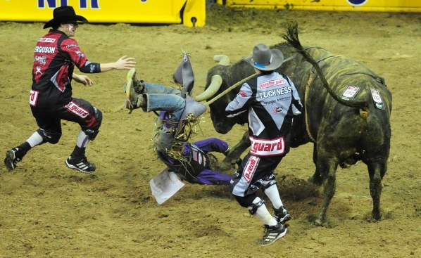 Bull rider Chandler Bownds from Lubbock, Texas, is bucked from his bull as bullfighters Dusty Tuckness and Aaron Ferguson, left, step in during the 8th go-round of the National Finals Rodeo at the Thomas & Mack Center in Las Vegas Thursday, Dec. 10, 2015. Josh Holmberg/Las Vegas Review-Journal