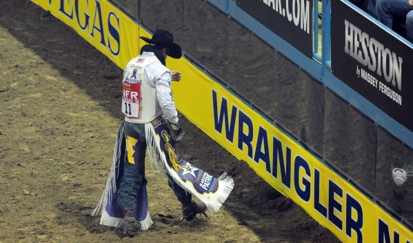 Bareback rider Caleb Bennett from Tremonton, Utah, reacts after he was bucked from his horse during the 8th go-round of the National Finals Rodeo at the Thomas & Mack Center in Las Vegas Thursday, Dec. 10, 2015. Josh Holmberg/Las Vegas Review-Journal