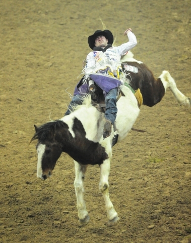 Bareback rider Steven Peebles from Redmond, Ore., rides rides Full Baggage to a first place score of 89.5 during the 8th go-round of the National Finals Rodeo at the Thomas & Mack Center in Las Vegas Thursday, Dec. 10, 2015. Josh Holmberg/Las Vegas Review-Journal