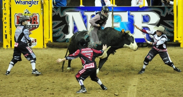 Bullfighters, from left, Dusty Tuckness, Aaron Ferguson and Cody Webster distract a bull ridden by Bull rider Ty Wallace during the 8th go-round of the National Finals Rodeo at the Thomas & Mack Center in Las Vegas Thursday, Dec. 10, 2015. Josh Holmberg/Las Vegas Review-Journal