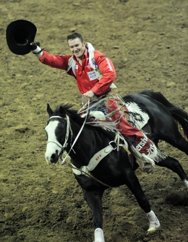 Bareback rider Steven Peebles from Redmond, Ore., celebrates his first place score of 89.5 during the 8th go-round of the National Finals Rodeo at the Thomas & Mack Center in Las Vegas Thursday, Dec. 10, 2015. Josh Holmberg/Las Vegas Review-Journal