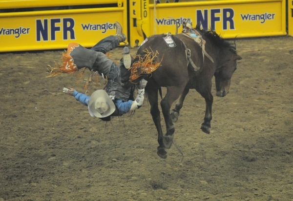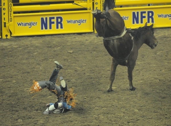 Bareback rider Caleb Bennett from Tremonton, Utah, is bucked from his horse during the 8th go-round of the National Finals Rodeo at the Thomas & Mack Center in Las Vegas Thursday, Dec. 10, 2015. Josh Holmberg/Las Vegas Review-Journal