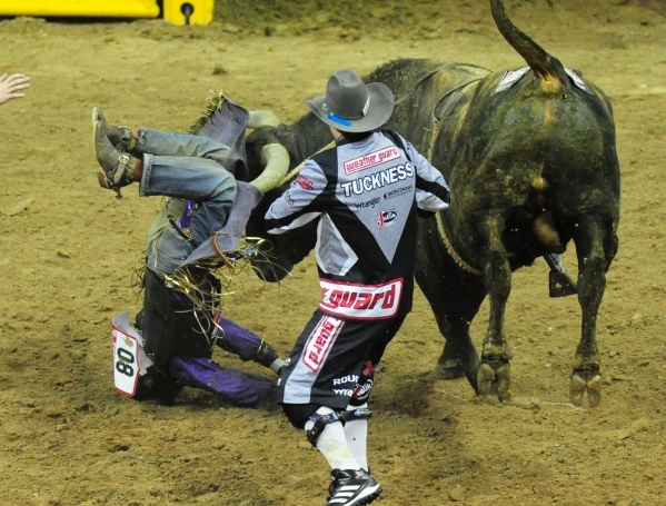 Bull rider Chandler Bownds from Lubbock, Texas, is bucked from his bull as bullfighters Dusty Tuckness and Aaron Ferguson, left, step in during the 8th go-round of the National Finals Rodeo at the Thomas & Mack Center in Las Vegas Thursday, Dec. 10, 2015. Josh Holmberg/Las Vegas Review-Journal