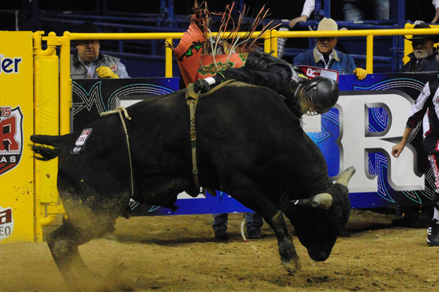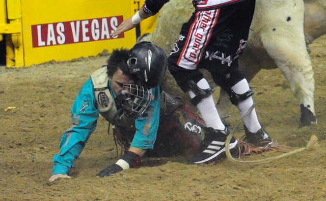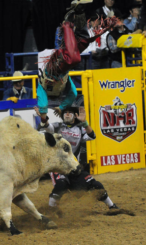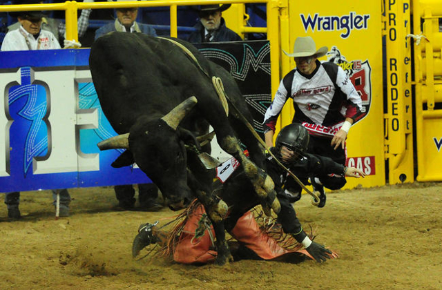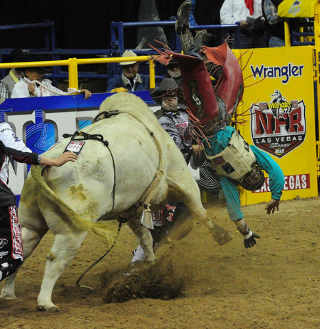 Bull rider Dustin Bowen from Waller, Texas, is bucked from his bull during the first go-round of the 2015 Wrangler National Finals Rodeo at the Thomas & Mack Center in Las Vegas Thursday, Dec. 03, 2015. Bowen suffered a contusion to his abdomen from the wreck. Josh Holmberg/Las Vegas Review-Journal