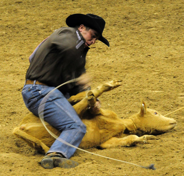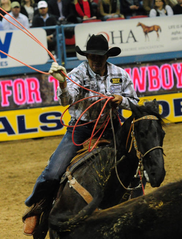 Ryan Jarrett from Comanche, Okla., competes in tie-down roping ropes a calf to a time 8.20 seconds score of 86 during the first go-round of the 2015 Wrangler National Finals Rodeo at the Thomas & Mack Center in Las Vegas Thursday, Dec. 03, 2015. Josh Holmberg/Las Vegas Review-Journal