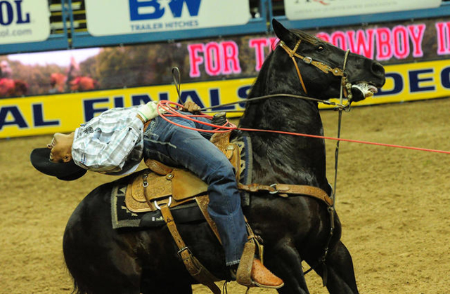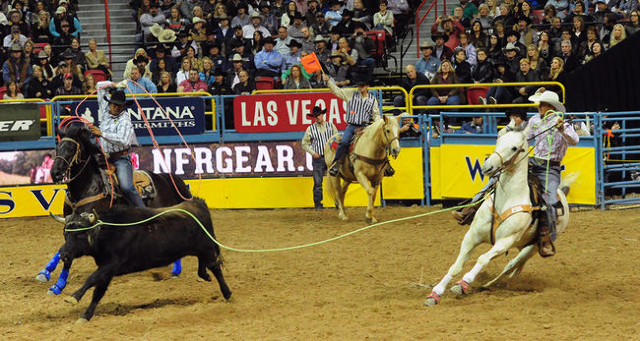 Team ropers Junior Nogueira from Scottsdale, Ariz., left, and JoJo LeMond from Andrews, Texas., are seen during the first go-round of the 2015 Wrangler National Finals Rodeo at the Thomas & Mack Center in Las Vegas Thursday, Dec. 03, 2015. Josh Holmberg/Las Vegas Review-Journal