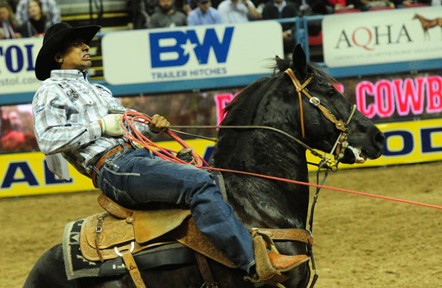 Team roper Junior Nogueira from Scottsdale, Ariz., pulls a rope tight on a calf a calf during the first go-round of the 2015 Wrangler National Finals Rodeo at the Thomas & Mack Center in Las Vegas Thursday, Dec. 03, 2015. Josh Holmberg/Las Vegas Review-Journal
