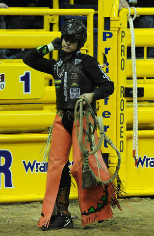 Bull rider Sage Kimzey from Strong City, Okla., reacts after being bucked from his bull during the first go-round of the 2015 Wrangler National Finals Rodeo at the Thomas & Mack Center in Las Vegas Thursday, Dec. 03, 2015. Josh Holmberg/Las Vegas Review-Journal