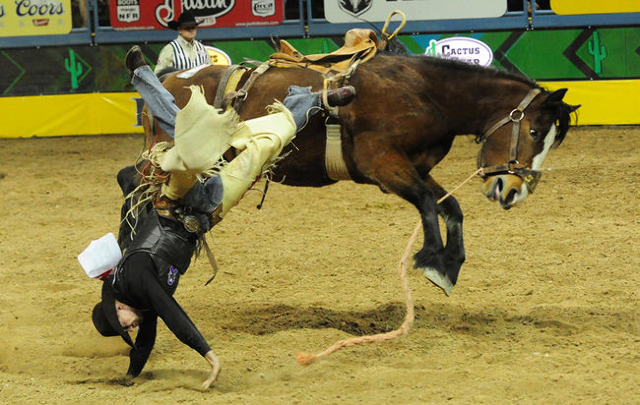 Saddle bronc rider Tyrel Larsen from Inglis, Manitoba, is bucked from his horse during the first go-round of the 2015 Wrangler National Finals Rodeo at the Thomas & Mack Center in Las Vegas Thursday, Dec. 03, 2015. Josh Holmberg/Las Vegas Review-Journal