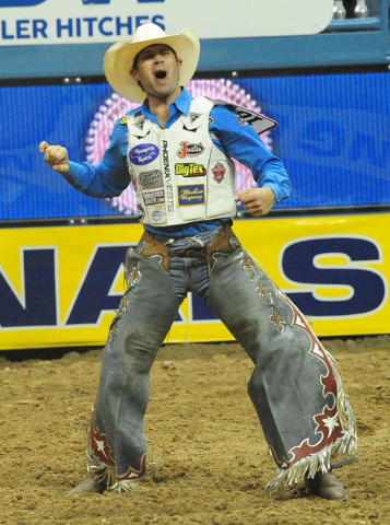 Saddle bronc rider Heath DeMoss from Heflin, La., celebrates his second place score of 86 during the first go-round of the 2015 Wrangler National Finals Rodeo at the Thomas & Mack Center in Las Vegas Thursday, Dec. 03, 2015. Josh Holmberg/Las Vegas Review-Journal