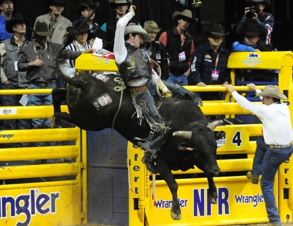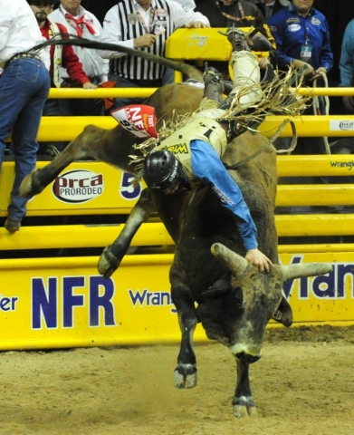 Bull rider Shane Proctor from Grand Coulee, Wash., rides his bull during the 6th go-round of the National Finals Rodeo at the Thomas & Mack Center in Las Vegas Tuesday, Dec. 8, 2015. Proctor was eventually bucked off. Josh Holmberg/Las Vegas Review-Journal
