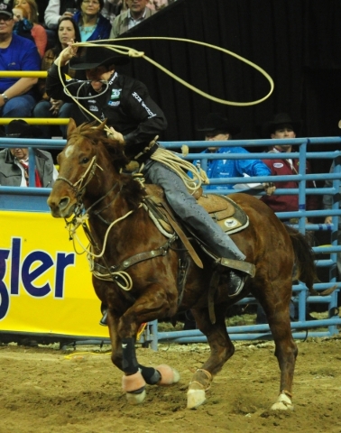 Trevor Brazile from Decatur, Texas, ropes a steer to a first place time of 6.8 seconds during the 6th go-round of the National Finals Rodeo at the Thomas & Mack Center in Las Vegas Tuesday, Dec. 8, 2015. Josh Holmberg/Las Vegas Review-Journal