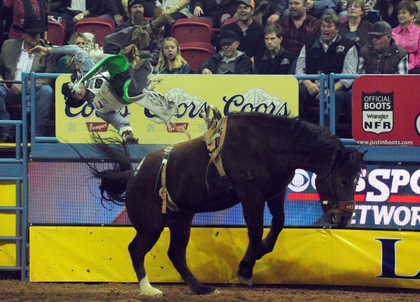 Bareback rider Clint Cannon from Waller, Texas, is bucked off Wilson Sanchez during the 6th go-round of the National Finals Rodeo at the Thomas & Mack Center in Las Vegas Tuesday, Dec. 8, 2015. Cannon suffered a concussion and a contusion on his lower right leg. He is questionable to return for the rest of the NFR. Josh Holmberg/Las Vegas Review-Journal