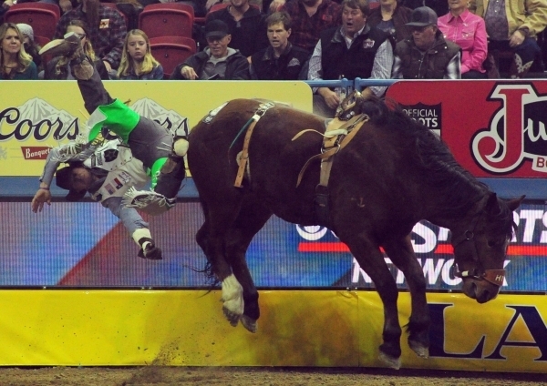 Bull rider Brennon Eldred from Sulphur, Okla., is bucked from his bull during the 6th go-round of the National Finals Rodeo at the Thomas & Mack Center in Las Vegas Tuesday, Dec. 8, 2015. Josh Holmberg/Las Vegas Review-Journal