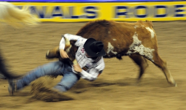 Steer wrestler Dakota Eldridge from Elko, Nev., wrestles a steer to a time of 4.6 seconds during the 6th go-round of the National Finals Rodeo at the Thomas & Mack Center in Las Vegas Tuesday, Dec. 8, 2015. Josh Holmberg/Las Vegas Review-Journal
