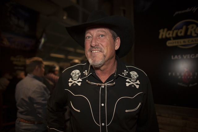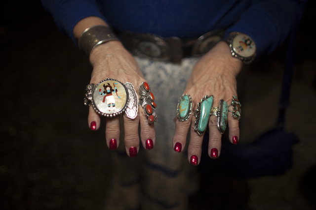 The Bushes have been coming to the rodeo for the past 20 years. Both worked in San Antonio for AT&T for many years. Sandy created their matching outfits, including her skirt and his shirt, as well as several other matching outfits they will wear throughout the event. At right, Sandy displays some of the turquoise rings she has collected over the past 43 years. She bought her belt buckle from Gold & Silver Pawn in downtown Las Vegas.