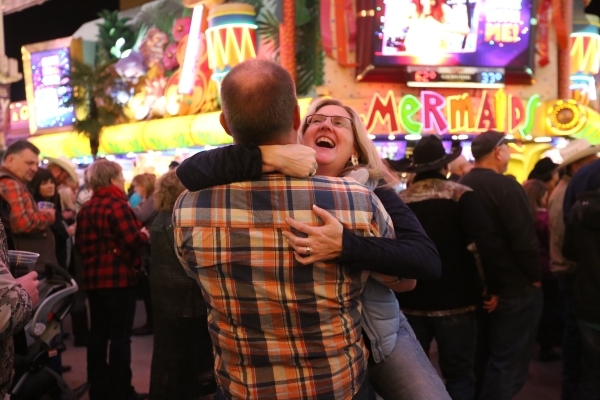 Cora Schumacher and James Black dance at Downtown Hoedown, the kick-off party for National Finals Rodeo, at the Fremont Street Experience in Las Vegas Wednesday, Dec. 2, 2015. Rachel Aston/Las Vegas Review-Journal Follow @rookie__rae