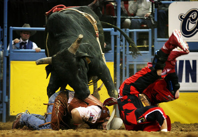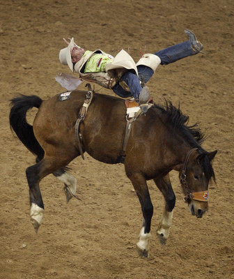 One goal is to keep your toes turned during the entire ride, but something tells me it’s not the same as a ballerina mastering first position. It’s also important to swing your feet over the horse’s shoulders in a split second, and as the animal bucks, to bend those knees and finish your spurring stroke, which sounds a little like the advice Lon Kruger might give on shooting free throws if his players did so from a saddle.