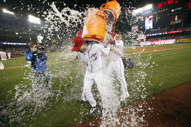 A giddy Scherzer smiled and yelped as he high-fived and hugged other Nationals players on the field. Then the pitcher was doused by his teammates during a postgame television interview.