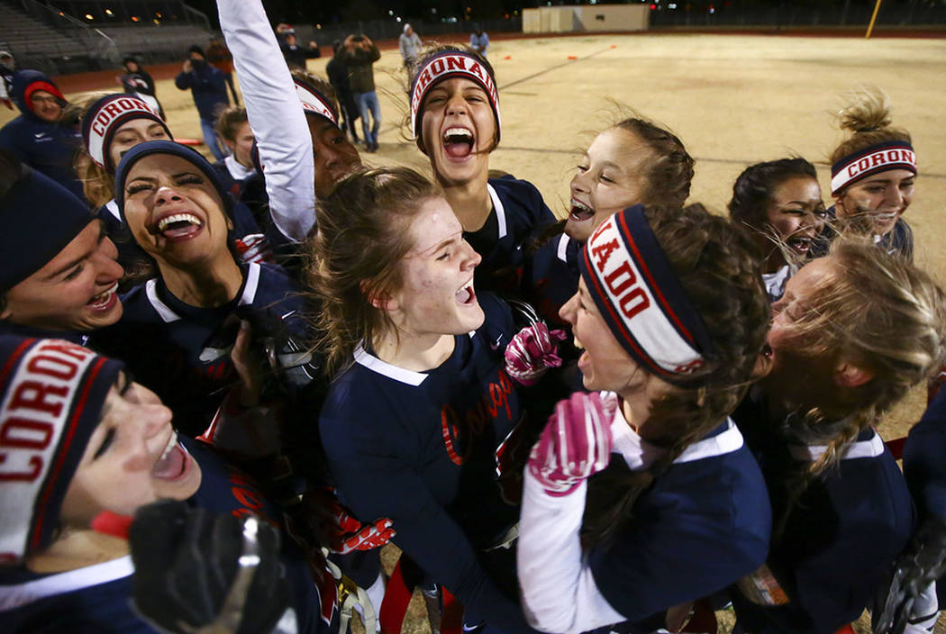 Several Coronado players fought back tears of joy during a midfield celebration where an Nevada Interscholastic Activities Association official presented the championship trophy.