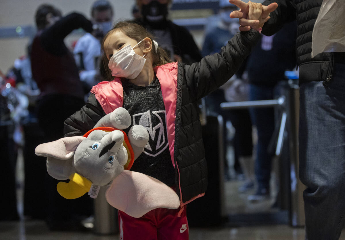 Amelia Simonis, 4, brings a toy elephant to throw on the ice after the first Silver Knights goal during the “Lucky Launch” charity event benefiting Toys for Tots before the start of an AHL hockey game against the Abbotsford Canucks on Sunday, Dec. 19, 2021, at the Orleans Arena, in Las Vegas. (Benjamin Hager/Las Vegas Review-Journal) @benjaminhphoto