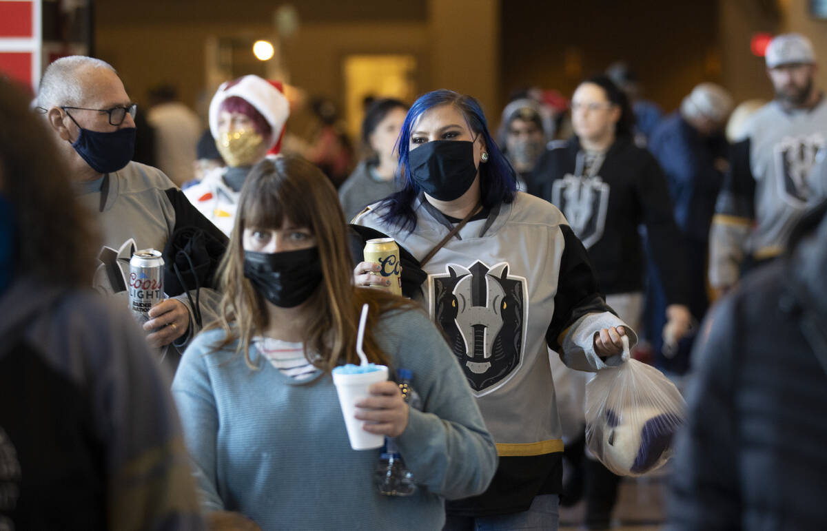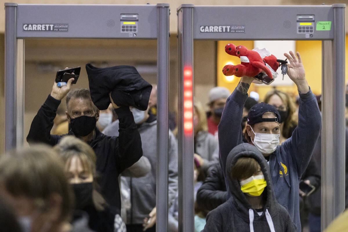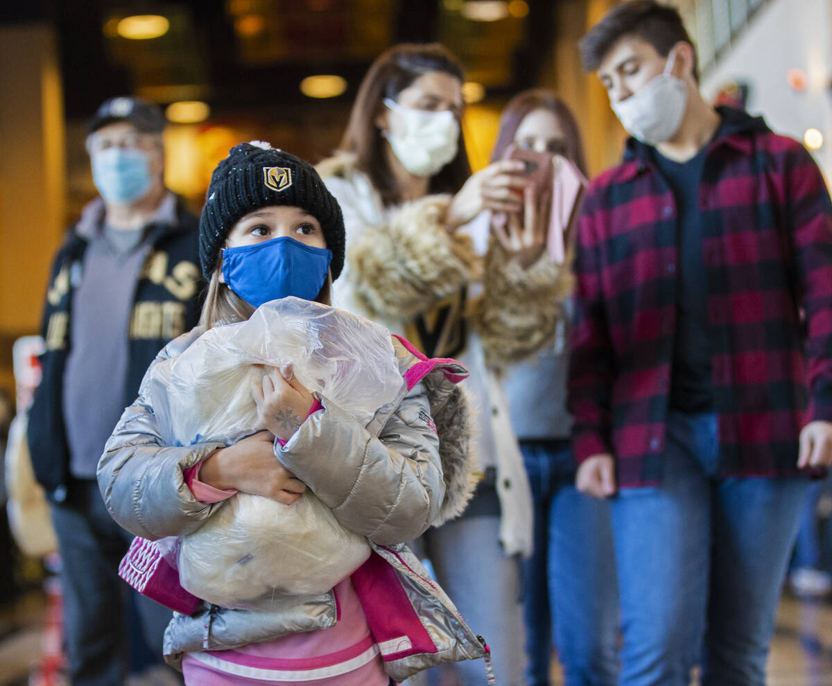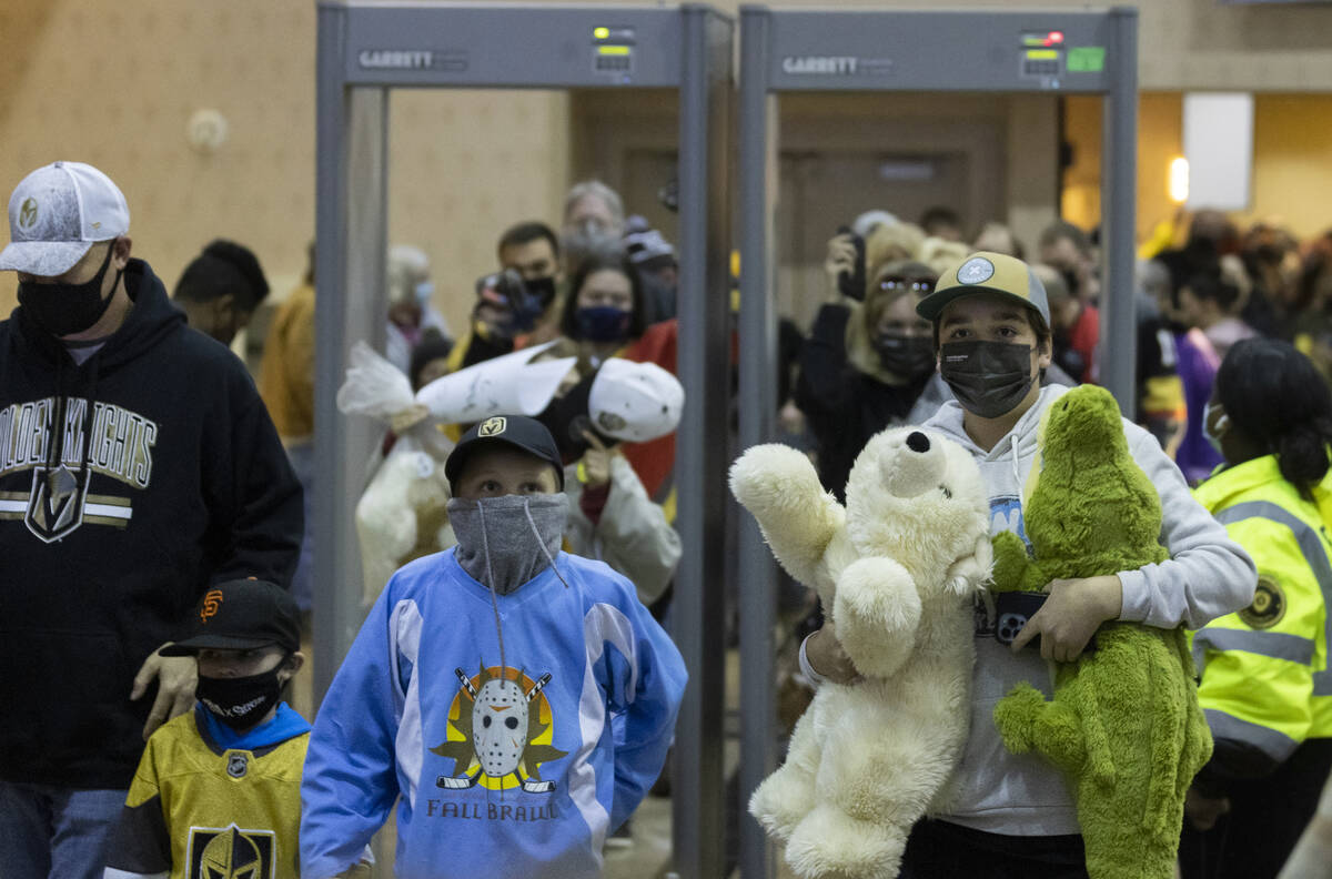 Fans bring stuffed animals through security to throw on the ice after the first Silver Knights goal during the “Lucky Launch” charity event benefiting Toys for Tots during an AHL hockey game against the Abbotsford Canucks on Sunday, Dec. 19, 2021, at the Orleans Arena, in Las Vegas. (Benjamin Hager/Las Vegas Review-Journal) @benjaminhphoto