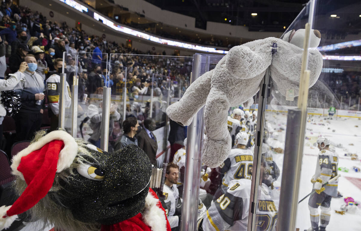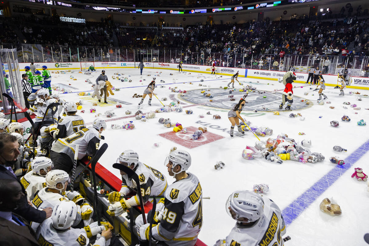 Fans bring teddy bears to throw on the ice after the first Silver Knights goal during the “Lucky Launch” charity event benefiting Toys for Tots before the start of an AHL hockey game against the Abbotsford Canucks on Sunday, Dec. 19, 2021, at the Orleans Arena, in Las Vegas. (Benjamin Hager/Las Vegas Review-Journal) @benjaminhphoto