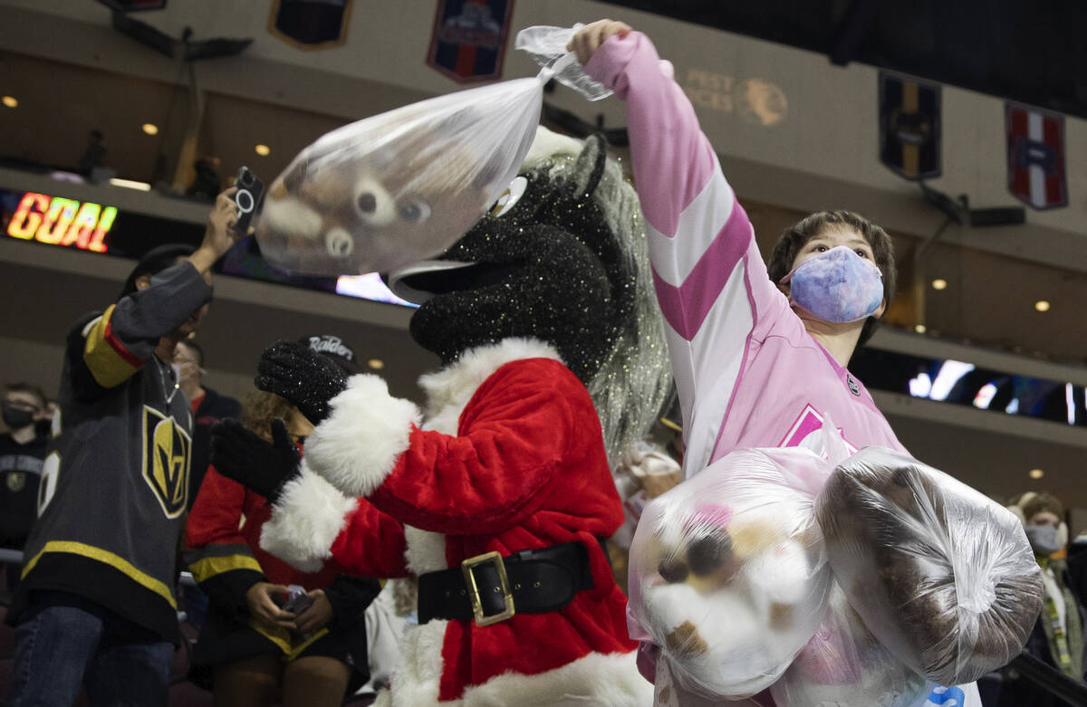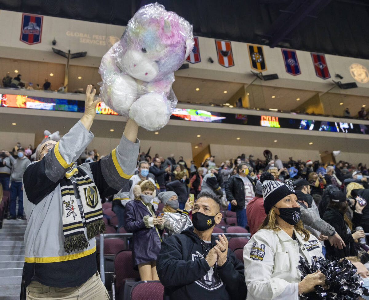 Fans bring stuffed animals to throw on the ice after the first Silver Knights goal during the “Lucky Launch” charity event benefiting Toys for Tots before the start of an AHL hockey game against the Abbotsford Canucks on Sunday, Dec. 19, 2021, at the Orleans Arena, in Las Vegas. (Benjamin Hager/Las Vegas Review-Journal) @benjaminhphoto