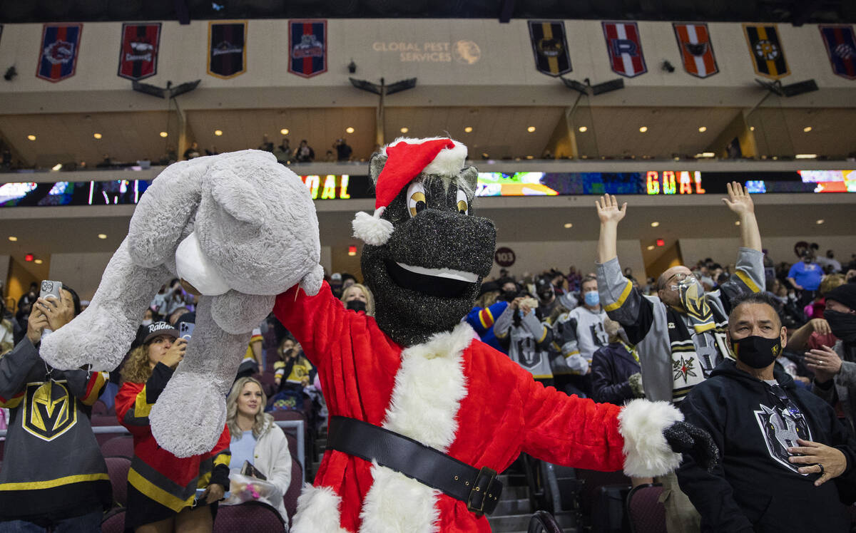 Silver Knights mascot “Lucky,” left, waits to throw a teddy bear on the ice after the first Henderson goal during the “Lucky Launch” charity event benefiting Toys for Tots during an AHL hockey game against the Abbotsford Canucks on Sunday, Dec. 19, 2021, at the Orleans Arena, in Las Vegas. (Benjamin Hager/Las Vegas Review-Journal) @benjaminhphoto