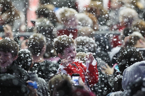 Curiously, the snow – which actually was soap suds – fell from the ceiling on only four sections of the arena. It didn’t snow on the ice.