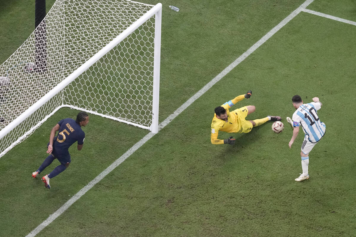 Argentina’s Lionel Messi, right, scores his side’s first goal passing France’s goalkeeper Hugo Lloris during the World Cup final soccer match between Argentina and France at the Lusail Stadium in Lusail, Qatar, Sunday, Dec. 18, 2022. (AP Photo/Thanassis Stavrakis)