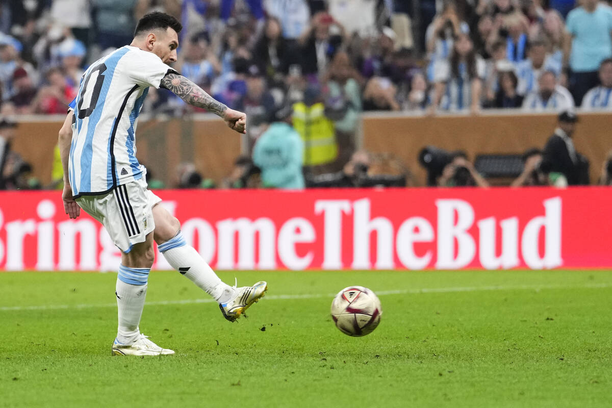 Argentina’s Lionel Messi scores his side’s opening goal during the World Cup final soccer match between Argentina and France at the Lusail Stadium in Lusail, Qatar, Sunday, Dec. 18, 2022. (AP Photo/Manu Fernandez)